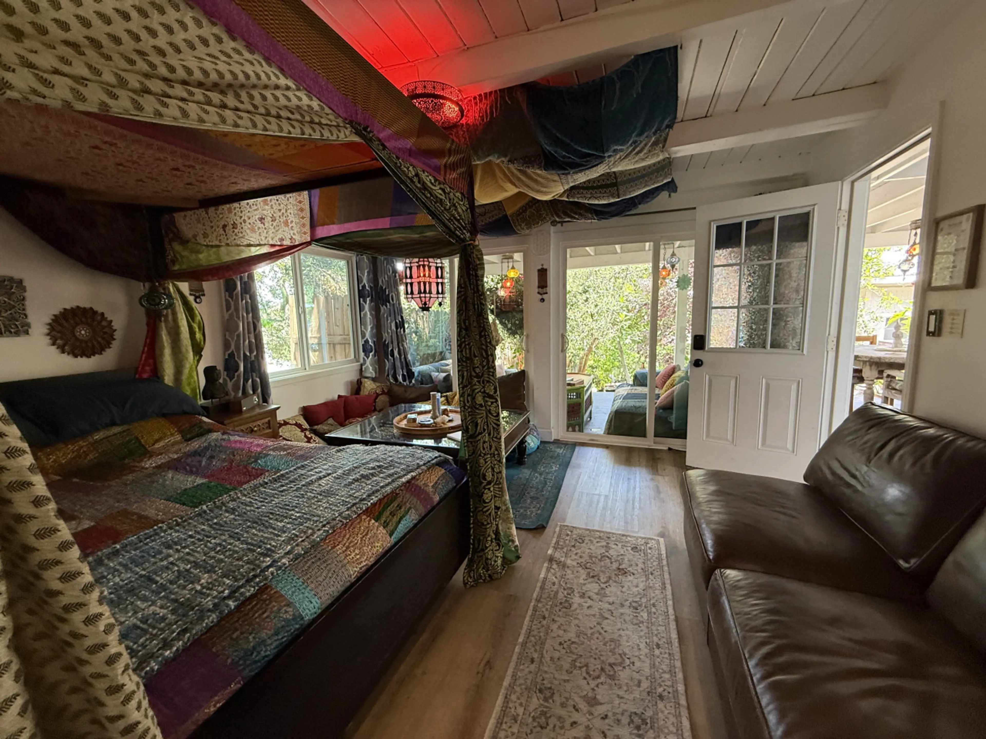Welcome to the Zen Den, a cozy studio retreat nestled in tranquility. This inviting space features a plush queen canopy bed, en-suite bath, and a kitchenette for light meals. The room opens onto a covered patio, perfect for unwinding in nature. Enjoy easy access to local attractions including ca...